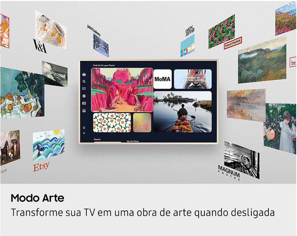 A Art Store é o coração do Modo Arte da The Frame, transformando sua TV em uma verdadeira galeria de arte digital. Veja como ela funciona e o que oferece: